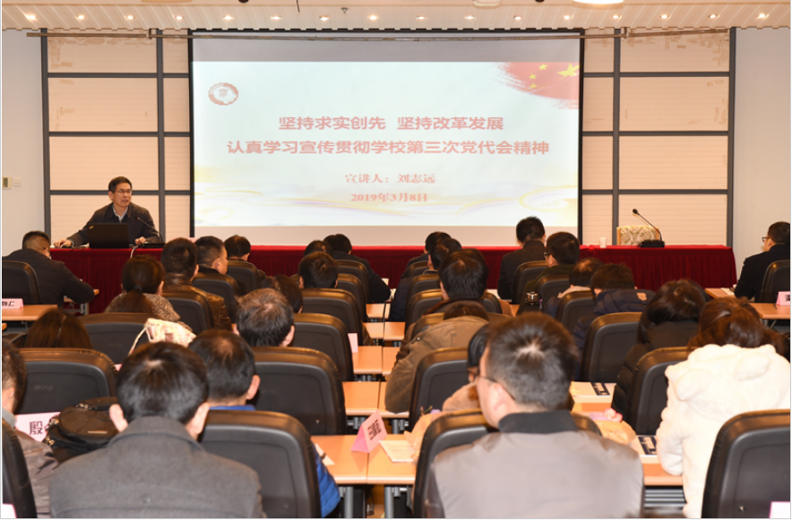 为深入学习贯彻学校第三次党代会精神,3月8日中午,校党委副书记刘志远在行政楼一楼学术报告厅为yl23411永利集团官网全体教职工作了题为“坚持求实创先,坚持改革发展,认真学习宣传贯彻学校第三次党代会精神”的宣讲。会议由yl23411永利集团官网党委书记张祚键主持。