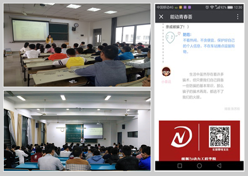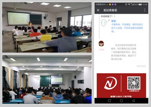 学院发挥新媒体平台的宣传作用,借助年级QQ群及时了解班级情况,做好舆情监控工作;借助学院微信公众平台“能动青春荟”向广大学子宣传校园安全知识,既生动又形象,深受学生欢迎。