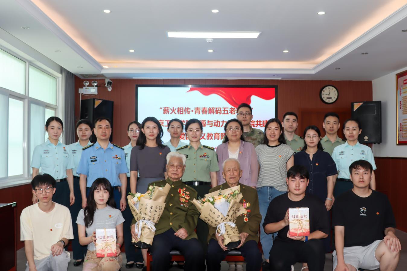 活动特别邀请两位德高望重的老首长常颖、邓洪庆,为师生讲述革命故事。他们用朴实的语言回顾战火岁月,分享亲历的军旅生涯与峥嵘时光,深情讲述信仰的力量、忠诚的初心,“请党放心,强国有我”的口号,引发在场师生强烈共鸣。青年学生代表向两位老首长敬献鲜花,并现场提问“如何坚定青年人的理想信念”“如何理解信仰的力量”“如何更好地报效祖国”。两位首长一一作答,以自己的奋斗经历鼓励青年学子珍惜和平生活、厚植家国情怀,把个人理想融入民族复兴的伟大事业。随后,两位老首长向青年学子赠送了两套弘扬中国共产党人伟大精神谱系的图书《红色血脉》。全体人员齐声合唱《强军战歌》,铿锵歌声中,红色信仰的火炬在军地之间、师生之间、代际之间完成了深情传递。