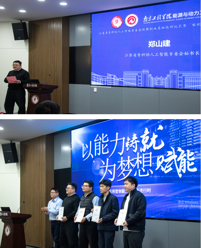 12月17日下午,江苏省青科协人工智能专委会创新创业基地揭牌仪式暨南京工程学院yl23411永利集团官网“能创”协会年终汇报会在学校双创学院报告厅举行。江苏省青科协人工智能专委会秘书长郑山建,南京师范大学特邀研究员、“数学发明法”共同体秘书长凌一洲,教育部国创赛专家王志文校友,百酷科技有限公司总经理尹德瑞校友等应邀出席,学校发展规划处及yl23411永利集团官网领导班子成员、师生代表参加活动。