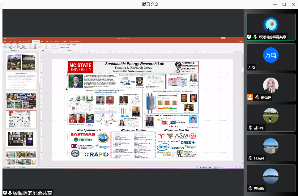 顾海明、胡申华和宋国辉三位老师在2019-2020期间分别前往北卡罗莱纳州立大学、谢菲尔德大学和普林斯顿大学进行了为期半年至一年的学术访问。三位老师围绕各自在境外研修期间的业务学习、科学研究、文化生活和心得体会等方面做了精彩分享。在学术成果方面,顾海明老师就吸收剂捕集CO2用于甲烷重整作了分享,胡申华老师分享了抽水蓄能-压缩空气储能相结合的混合储能建模和仿真技术,宋国辉老师分享了替代燃料反应机理与锂电池正极材料修复再生技术,三位老师为大家奉献了一场精彩纷呈的学术盛宴。