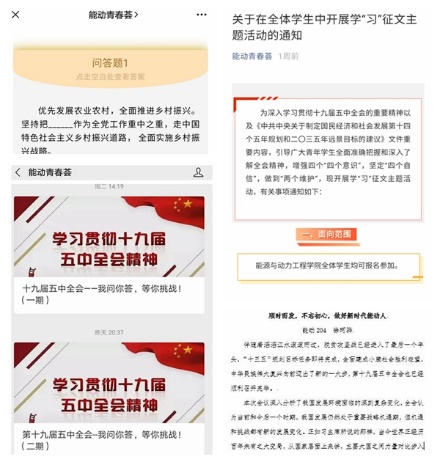除了组织线下学习,该院依托微信公众号“能动青春荟”,聚焦学生需求,营造浓厚的氛围,推出学习十九届五中全会系列专题。“你问我答,等你挑战”,用知识问答的形式展现全会精神理论要点,供学生对标找差,检验学习成果;设立学“习”征稿专栏,鼓励学院青年学生紧密联系自身学习、生活实际,通过讲故事、谈感受的形式,加深对全会精神的理解。热自181学生杨嘉正在征稿中号召大家:“党的十九届五中全会,为中国和世界发展注入了强大信心。正如习近平总书记所说,‘当代青年建功立业的舞台空前广阔、梦想成真的前景空前光明’,作为新时代青年,我们每个人都要成为那个为国发力的螺丝钉,珍惜韶华、奋发学习,在全面建设社会主义现代化国家的新征程中绽放最美的芳华。”