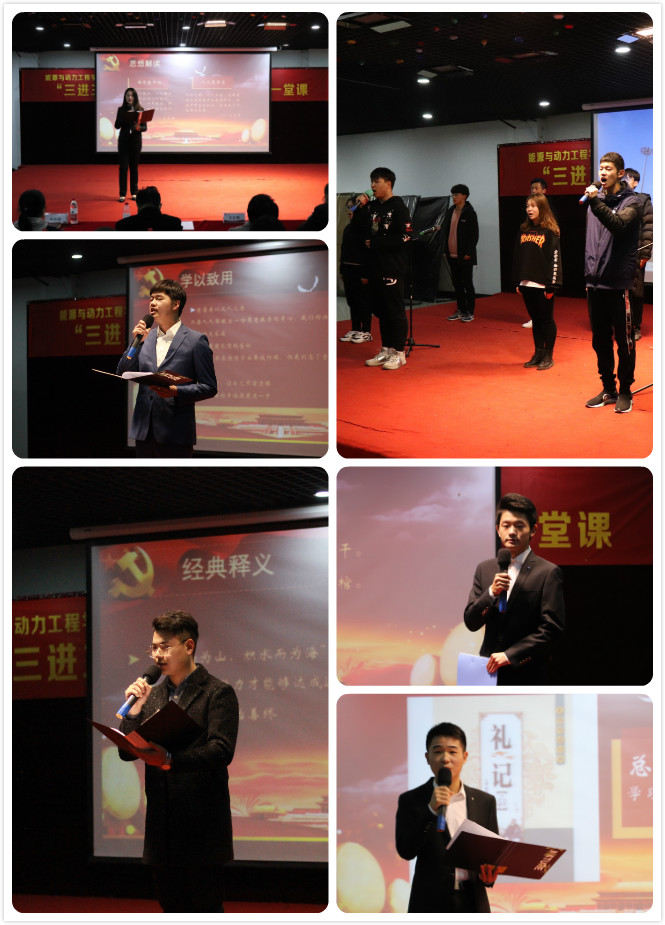 热自171班李雨婷同学将“国德”与“人德”相联系,以宋代名臣范仲淹的故事言明人无德不立的道理,通过总书记的讲话阐明社会主义核心价值观的意义。倡导青年人牢记总书记嘱托,做到“勤学、修德、明辨、笃实”;制冷181班李治同学带领大家回顾了耳熟能详的《游子吟》,了解总书记如何重孝行孝,感受全社会孝老爱亲的温馨风尚,并发出常回家陪伴父母,给予身边老人更多关心的倡议;能卓171班陆路同学围绕“积土而为山,积水而为海”进行解读,结合总书记对青年“要力行,知行合一,做实干家”的寄语,号召同学们应肩负起时代赋予的重任,努力学习,实践笃行的共勉;热自181班高玉淇同学从学习谈起,深入理解习总书记关于青年人“为何学、学什么、怎么学”的论述,号召同学们“让勤奋学习成为青年远航的动力,让增长本领成为青春搏击的力量”。能卓181班的曹智阳同学以“家国”立意,带领大家了解五千年来先贤志士的崇高爱国理想,深刻解析总书记对广大党员理想信念的教育意义,呼吁大学生应将“心系祖国“作为理想出发点,时刻牢记身上的使命,努力学习,踏实工作,为中华民族伟大复兴而不断奋斗。