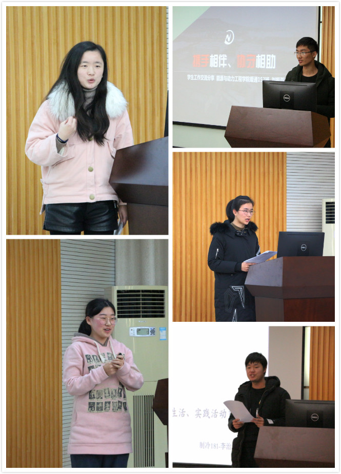 会上,集控171陈磊、核工程181杨泽雨等十名同学结合PPT分别就自己入学以来的学习、工作、生活、社会实践等方面进行介绍。同学们分享收获,总结不足,畅谈未来规划。大家畅所欲言,分享自己的感受,并提出自己的求学困惑。为了帮助同学们解决问题,体现榜样示范作用。该院安排2017/2018学年“校十大校园之星之团队之星获得者”暖通152刘振亚,2017/2018学年“校十大优秀学生标兵”集控151张佳钰与能动161洪余等三位优秀同学进行经验分享与交流,为同学们答疑解惑。刘振亚同学结合自己担任学生干部的工作经历,分享了自己的感悟,他建议学弟学妹学会平衡学习与学生工作,实现均衡发展。做为一名学生干部,要有强烈的责任心,以服务师生为信仰,热爱自己的事业,才能更好完成工作。张佳钰同学则从自己的考研经历谈起,为同学们进行了考研启蒙教育。提醒大家合理自我定位,提前确定考研目标,在平时的学业中不断积累,夯实基础;在未来的考研中,能够合理规划学习进度,坚持不懈完成考研;找到志同道合的研友,互相帮助,共同进步。洪余同学以“文理交融,多元并举”为分享主题,以英语学习为例,与大家畅谈了自己的高分秘籍:“没有什么知识是学不好的,如果有那就再多花一些时间。”鼓励大家勤奋刻苦,付出终有收获;她还结合自己的科创经历,告诫大家学会“懒人思维”,从生活小事做手,学会改变思维,创新就在点滴间;洪余也建议同学们在学好专业知识的同时,能够多读书,提升人文修养,培养综合能力。