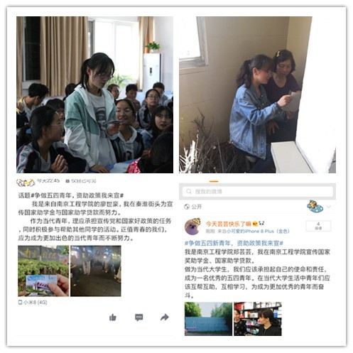 为纪念五四运动100周年,引领广大青年感悟爱国精神、担当时代责任,学院选拔优秀受助学生、优秀学生干部通过校内、校外两个阵地开展政策宣传和公益服务。在校内开展常态化宣传:利用课余时间和周末,在校内宣传资助政策,发放有关资料;在校外组组织学生回家乡、进学校、入村入户,宣传学生资助政策,并“现身说法”,结合自己在国家和学校资助政策的帮助下安心学习、健康成长的亲身经历,帮助学弟学妹和他们的家长解除后顾之忧。